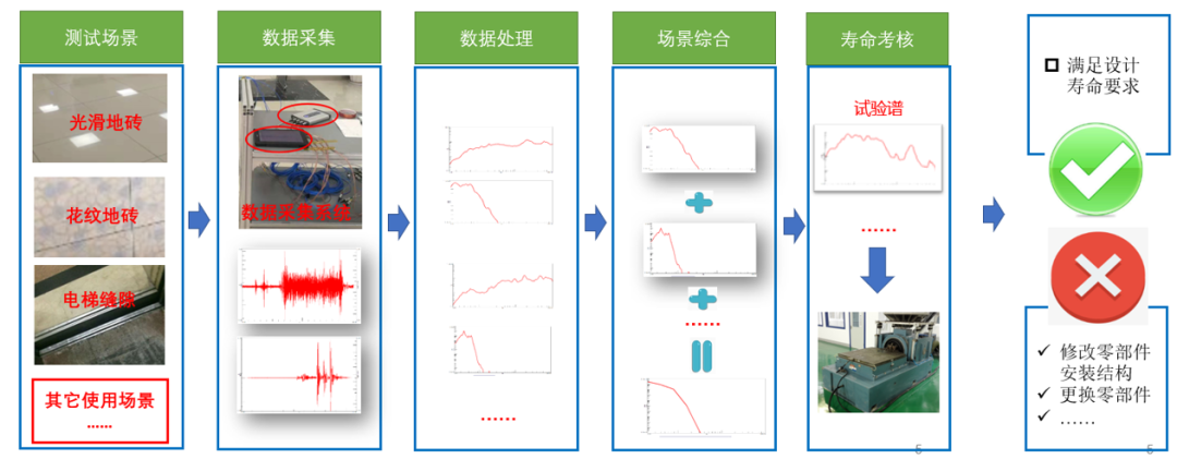 针对服务机器人在多种使用场景下,如何考核零部件设计使用寿命,下面给出了相应的疲劳寿命试验设计流程,主要包括:确定测试场景和工况、采集数据、数据处理、多种场景综合、制定出振动和冲击测试条件。